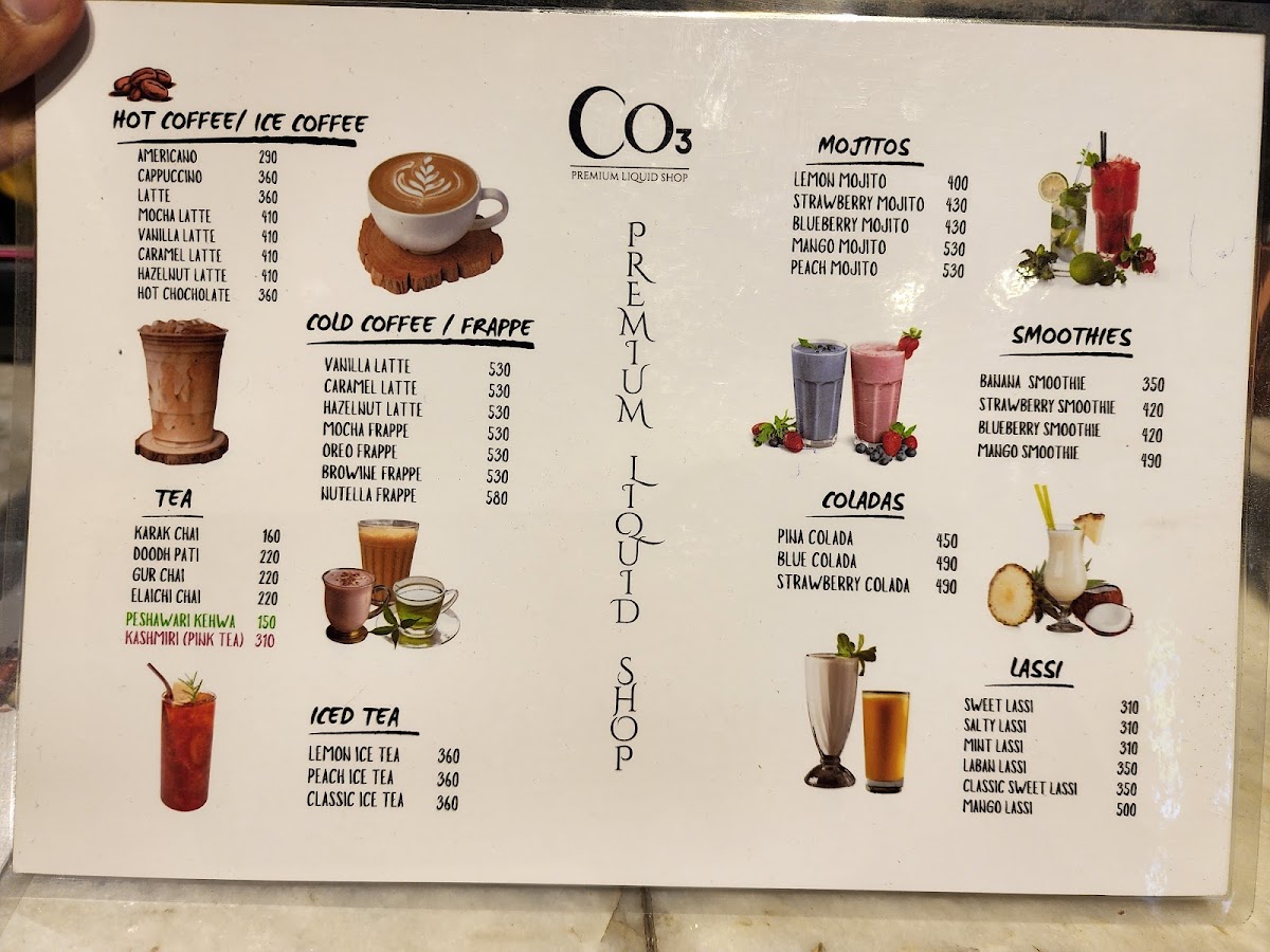 The menu at CO3 - The Premium Liquid Shop features a variety of specialty beverages primarily focused on refreshing drinks suitable for casual enjoyments and light refreshments. It is structured into distinct beverage categories including Coladas, Lassis, and Iced Teas, offering a range of flavors and base ingredients.